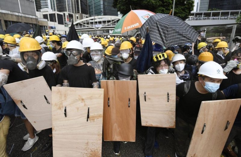 Протестите требаше да бидат мирни, но имаше судири со полицијата. Полицијата во неделата употреби солзавец во обидот да ги растера демонстрантите. Најмалку девет лица на возраст меѓу 17 и 59 години се повредени во судир меѓу полицијата и демонстрантите, соопшти Одделот за информации на Хонгконг.