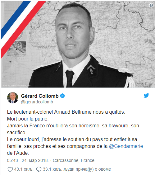 „Почина за својата земја. Франција нема да ги заборави неговата храброст и жртва“, напиша Коломб на „Твитер“, наведувајќи го името за храбриот полицаец, Арно Белтрам.