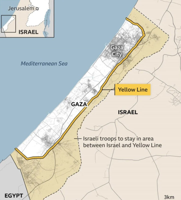 Тие го разгледаа уништувањето во рамките на таканаречената Жолта линија – границата што се протега по должината на север, југ и исток од Појасот Газа. Во октомврискиот договор за прекин на огнот, Израел се обврза да ги повлече силите на оваа линија, која е обележана со жолта боја на израелските воени карти.