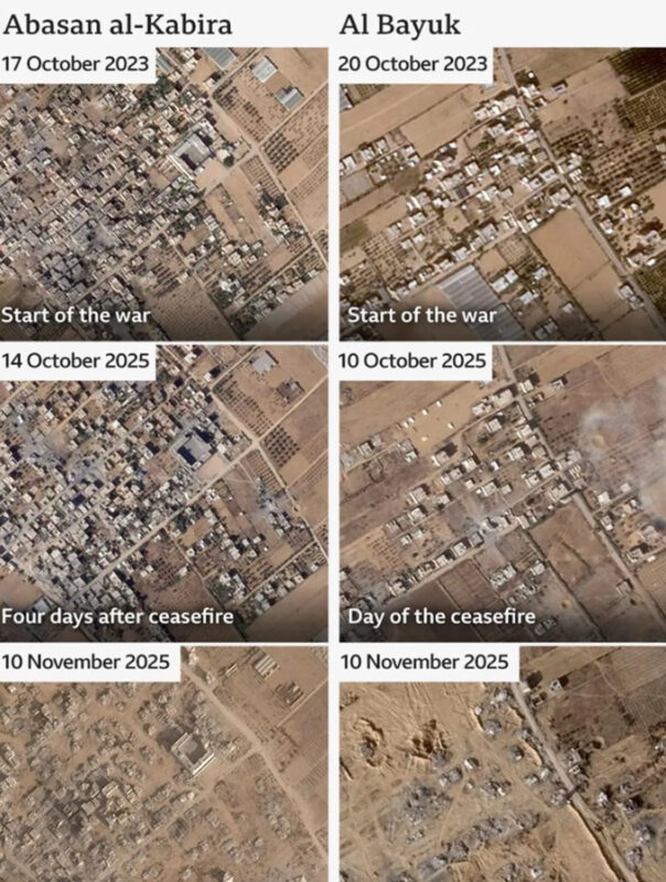 Новите слики – најновите направени на 8 ноември – покажуваат дека цели населби под израелска контрола се срамнети со земја за помалку од еден месец, во она што се чини дека е планирано уривање.
