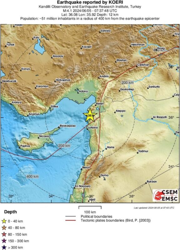 Епицентарот бил на 26 километри од Антакија, а земјотресот е регистриран на длабочина од 12 километри.