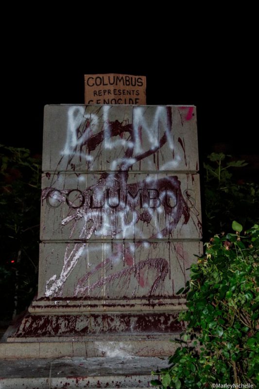 Демонстрантите ја опколија статуата, која беше ишарана со графити. На еден знак поставен на постаментот се вели: „Колумбо претставува геноцид“. По извикувањата за уривање, демонстрантите со јаже ја обвија статуата висока 2,5 метра за да ја соборат.