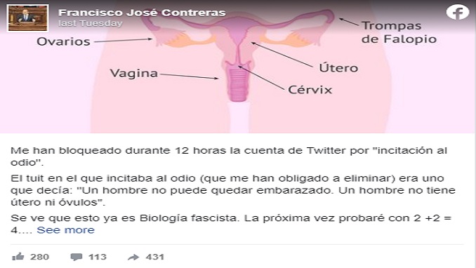 „Твитер“ привремено го суспендирал профилот на Франциско Хозе Контрерас, член на шпанската десничарска партија Вокс откога напишал дека „маж не може да забремени“, што платформата го смета за кршење на нејзината политика за говор на омраза, пренесува „Спутник“.