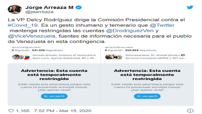 „Потпретседателката Делси Родригез ја предводи претседателската комисија против Ковид-19. Нехуманиот и невнимателен гест на ‘Твитер’ ги ограничува корисничките сметки @DrodriguezVen и @ViceVenezuela, кои се извор на информации неопходни за луѓето од Венецуела во овие непредвидливи околности“, напиша Ареаца на „Твитер“.