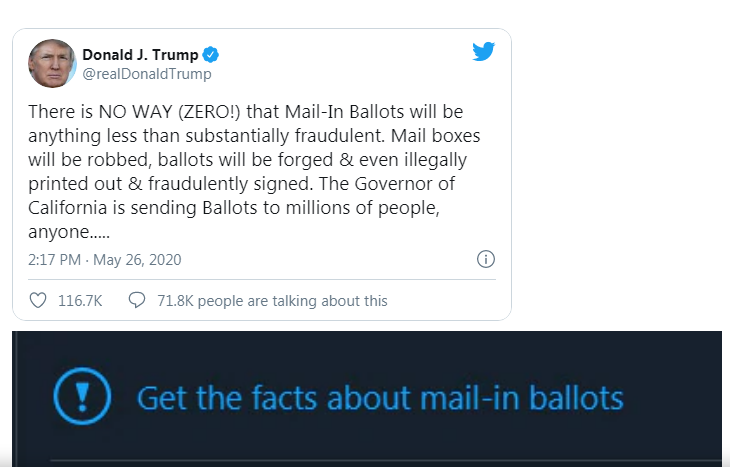 Со син извичник, „Твитер“ под твитот на Трамп ги предупредува корисниците да ги проверат фактите за гласањето по пошта и ги насочува кон страница со написи од весници и информации, што тимот за проверка на факти ги дознал за тврдењата на Трамп.