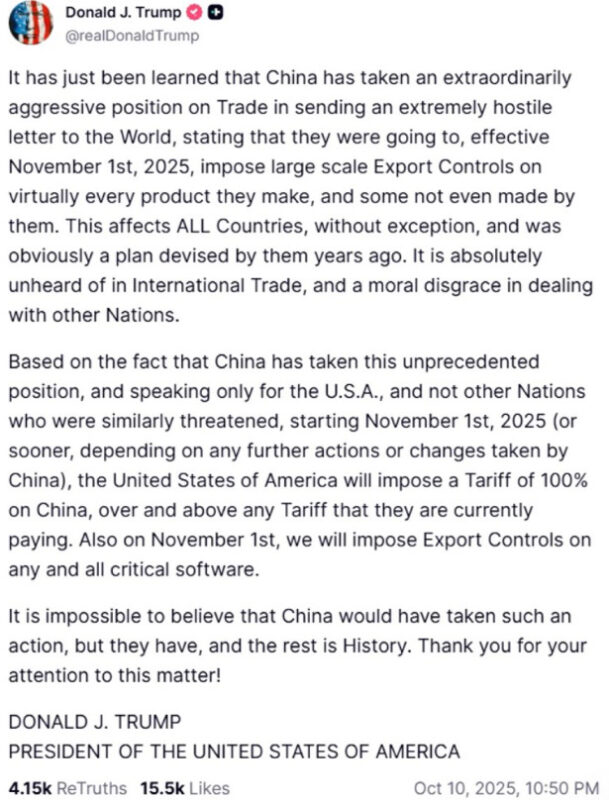 „Врз основа на фактот дека Кина зазеде оваа невидена позиција и зборувајќи само во име на САД, а не за други земји кои се слично изложени на ризик, почнувајќи од 1 ноември 2025 година (или порано, во зависност од понатамошните дејствија или промени преземени од Кина), Соединетите Американски Држави ќе воведат 100% царина за Кина, покрај сите царини што ги плаќа во моментов“, напиша Трамп.