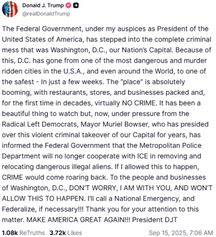 „За само неколку недели градот процвета… Првпат по децении, практично нема криминал“, напиша Трамп на платформата „Тру соушал“.