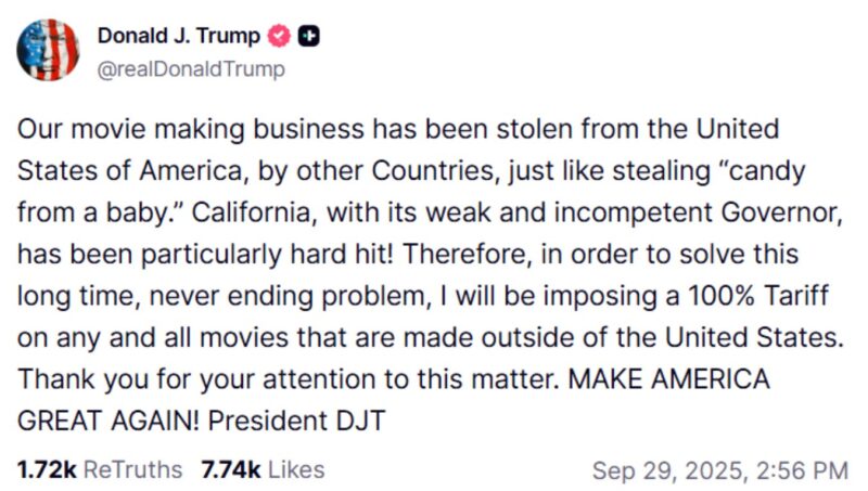 „Нашата филмска индустрија е киднапирана од други земји, исто како што крадат бомбони од деца. Калифорнија, со својот слаб и некомпетентен гувернер, е особено силно погодена! Затоа, за да го решам овој долгогодишен и бесконечен проблем, ќе воведам 100 проценти царина на сите филмови направени надвор од Соединетите Американски Држави. Ви благодарам за вашето внимание“, објави тој.