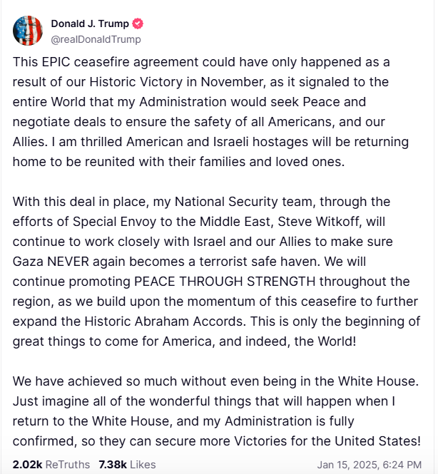 Новоизбраниот американски претседател Доналд Трамп ја презеде заслугата за договорот за прекин на огнот меѓу Израел и Хамас во уште една објава на платформата „Трут соушал“.