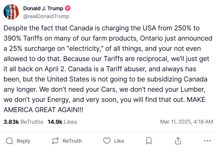Американскиот претседател Доналд Трамп се огласи откога канадската провинција Онтарио објави дека ќе им наплати на американските домаќинства 25 отсто повеќе за електрична енергија како одговор на американските царини.