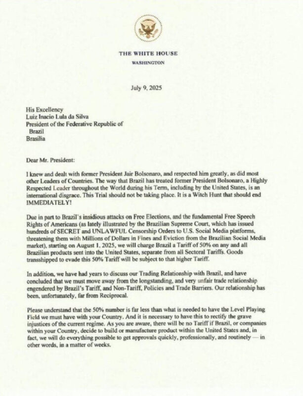 Тој го објави планот во писмо за царините што го сподели на социјалните мрежи. Во писмото се обвинува Бразил за „напади“ врз американските технолошки компании и „лов на вештерки“ против поранешниот ултрадесничарски претседател Жаир Болсонаро, кој се соочува со кривични обвиненија за неговата наводна улога во обидот за поништување на резултатите од претседателските избори во 2022 година.
