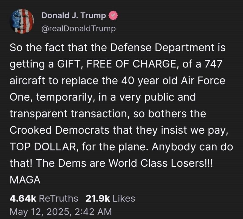 Трамп се чини дека е подготвен да го прифати подарокот од Катар. Во неделата, тој објави на социјалните мрежи: „Значи, фактот што на Министерството за одбрана му се подарува, бесплатно, авион 747 за привремена замена на 40-годишниот „Ер Форс Уан“, во многу јавна и транспарентна трансакција, толку многу ги вознемирува корумпираните демократи што инсистираат да платиме најмногу долари за авионот. Демократите се губитници од светска класа!!!“.