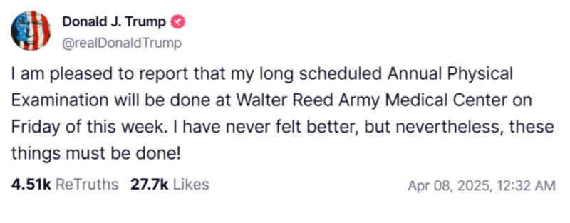 „Никогаш не сум се чувствувал подобро, но сепак, мора да се направи!“, напиша 78-годишниот Трамп во објава на платформата Truth Social.