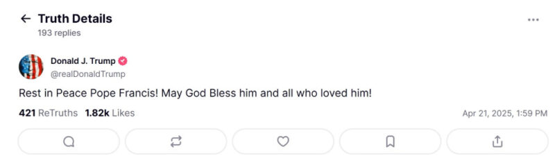 Американскиот претседател со кратка објава изрази почит на својата социјална мрежа Truth Social. Иако Доналд Трамп не се сретна со Папата за време на неговиот сегашен мандат, тие се сретнаа за време на неговиот прв мандат во 2017 година. „Почивај во мир, папа Франциско! Господ да го благослови него и сите оние кои го сакаа!“ напиша Трамп.