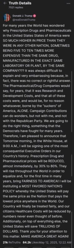 Затоа, со задоволство објавувам дека утре наутро, во 9:00 часот во Белата куќа, ќе потпишам една од најважните извршни наредби во историјата на нашата земја. Цените на лековите што се издаваат на рецепт и фармацевтските производи ќе бидат НАМАЛЕНИ, речиси веднаш, за 30% до 80%. Цените ќе растат низ целиот свет за да се изедначат и, за прв пат по години, да донесат ПРАВДА во АМЕРИКА! Ќе воспоставам политика на најповластена нација, според која Соединетите Американски Држави ќе плаќаат иста цена како и земјата со најниски цени насекаде во светот. Конечно, нашата земја ќе биде третирана фер, а трошоците за здравствена заштита за нашите граѓани ќе бидат намалени за износи за кои претходно не ни се ни помислувало“, напиша Трамп.