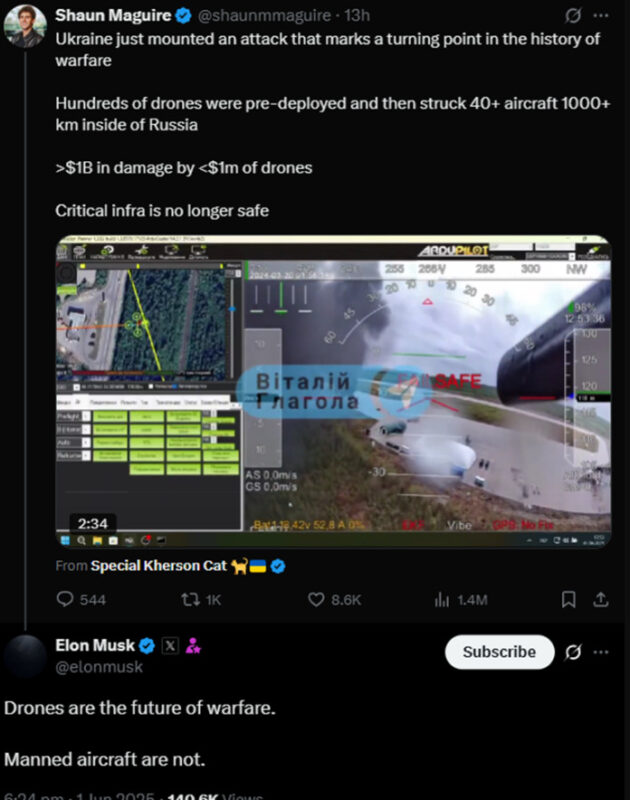 „Дроновите се иднината на војувањето. Пилотираните авиони не се“, напиша Маск на „Икс“ коментирајќи ги објавените снимки од украинскиот напад.