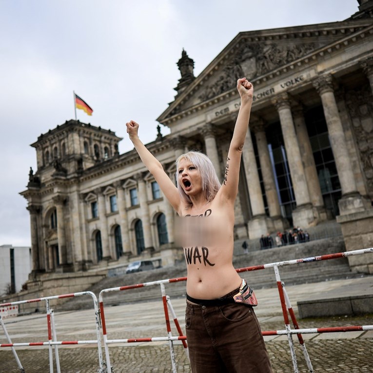 Активисти попладнево се појавија без маици пред зградата на Рајхстагот во Берлин, држејќи транспаренти.