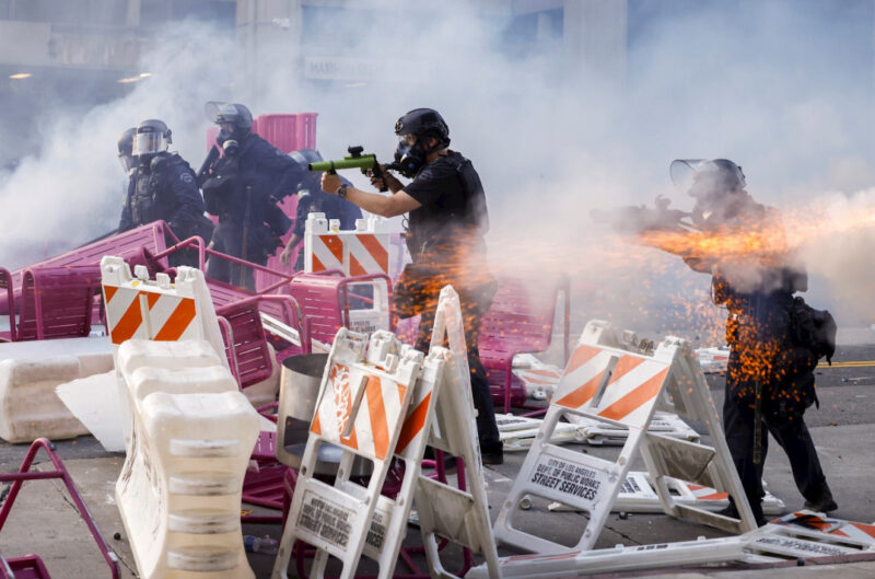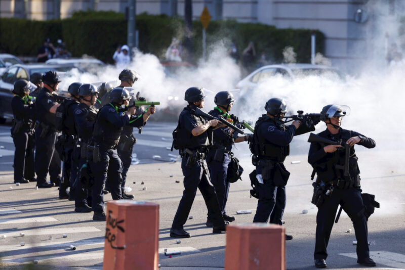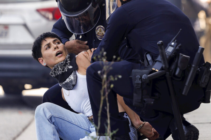Десет лица беа уапсени од полицијата во Лос Анџелес, вклучувајќи едно лице кое наводно фрлило молотов коктел и друго кое беше обвинето дека возело мотоцикл низ полициска линија.