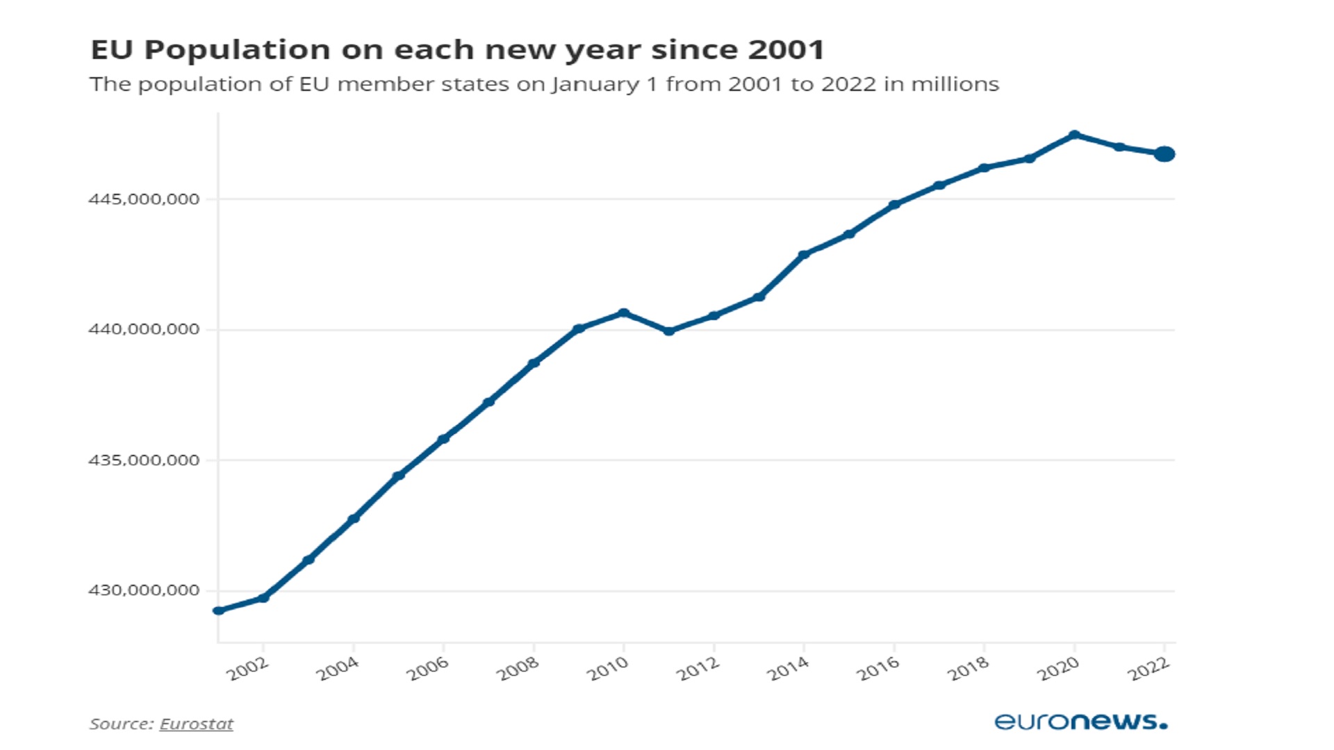 Популацијата на ЕУ растеше на годишно ниво до јануари 2020 година, а потоа почна да го зголемува негативниот тренд, кој им се припиша на жртвите предизвикани од пандемијата на Ковид-19.
