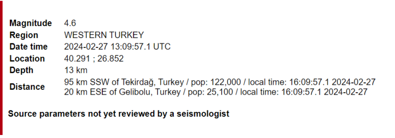 Епицентарот на земјотресот е на 20 километри од градот Гелиболу во провинцијата Чанаккале, на длабочина од 13 километри.