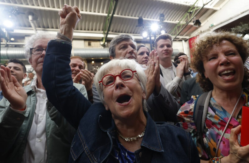 Приврзаниците на екстремно левичарската партија беа видени со кренати раце како ги слават проекциите на големите екрани.