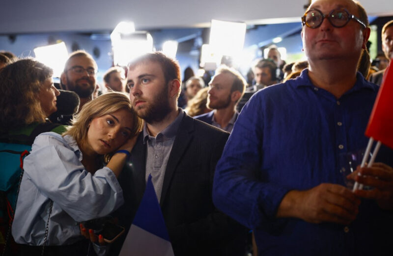 Но, расположението не беше толку радосно во седиштето на Националниот собир во Париз, каде што поддржувачите на партијата изгледаа уништено.