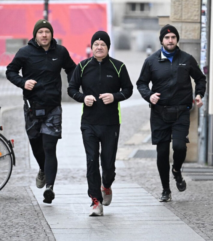 Актуелниот канцелар Олаф Шолц утрово трчајки, придружуван од чувари, го започна изборниот ден во Потсдам.