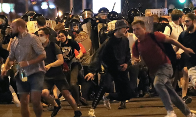 Припадници на интервентната полиција во центарот на Минск ги спуштија штитовите во знак на солидарност со демонстрантите за време на протестот во главниот град на Белорусија....