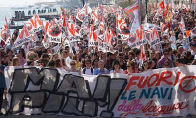 Илјадници луѓе во Венеција протестираа денеска барајќи забрана за влез на големи бродови за крстарење во познатата лагуна во градот, една недела по несреќата меѓу крузер...