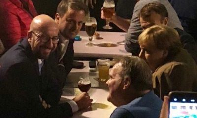 Германската канцеларка Ангела Меркел, францускиот претседател Емануел Макрон, премиерот на Белгија Шарл Мишел и премиерот на Луксембург Гзавије Бетел, се напија пиво во еден бриселски бар,...