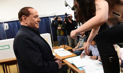 Во моментот кога поранешниот италијански премиер Силвио Берлускони пристигна да гласа на парламентарните избори, одеднаш топлес активистка на ФЕМЕН скокна на масата и му порача дека...