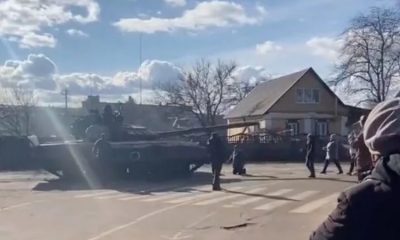 Драматично видео од Бахмач, Украина, прикажува украински граѓани како стојат пред руските тенкови, обидувајќи се да ги спречат да се движат напред. Снимката покажува тенкови како...