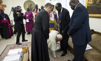 Папата Франциск во досега невиден гест, клекнат на колена ги бакнуваше стопалата на лидерите на Јужен Судан, кои претходно меѓусебно војуваа и ги повика да не...