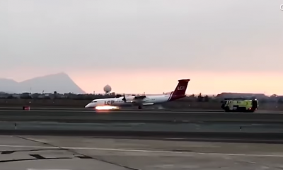 На драматична снимка од слетување на авион се гледа како од трупот летаат искри, додека леталото без предни тркала ја допира пистата на аеродром во Перу....