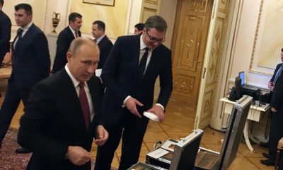 По средбата и заедничката прес-конференција во Кремљ, претседателите на Русија и на Србија, Владимир Путин и Александар Вучиќ, си разменија подароци. Вучиќ на неговиот руски колега...
