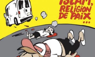 На насловната страница на францускиот сатиричен магазин „Шарли ебдо“ прикажани се луѓе како лежат на улица во крв откако ги прегазило комбе, со зборовите „Ислам, религија...