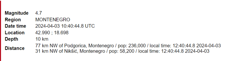 Епицентарот на земјотресот е на 31 километар од Никшиќ, на длабочина од 10 километри.