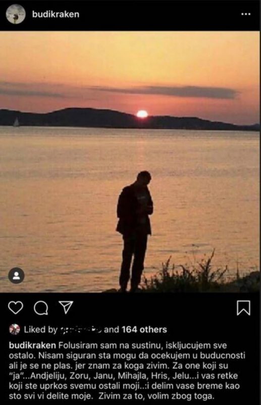 „Фокусиран сум на суштината, исклучувам сè друго. Не сум сигурен што можам да очекувам во иднина, но не се плашам од неа затоа што знам за кого живеам. За оние коишто се „мои” … Анѓелија, Зора, Јана, Михајла, Хрис, Јела … а за вас малкумина кои останавте мои и покрај сè … и јас го споделувам вашиот товар како што вие го носите мојот. Јас живеам за тоа, сакам поради тоа”, напиша тој.