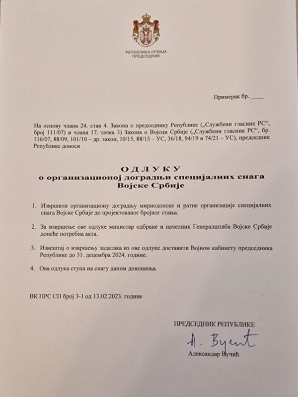 Еден од нив се однесува на проширувањето на воената организација на Специјалците на Војската на Србија до проектираниот број.
