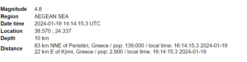Земјотресот се случил во 16:14 часот по локално време, на 23 километри источно-југоисточно од Кими на Евиа.