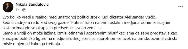 „Еве колку вреди српскиот диктатор Александар Вучиќ во вистинската меѓународна политика… тој седи во задниот ред кај својот шеф Путин, како и на сите други важни меѓународни состаноци каде што се собираат претседателите на земјите.