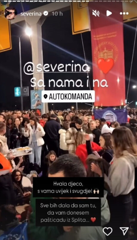 52-годишната сплитска пејачка на својот профил сподели неколку кадри од атмосферата од Белград. Во една од објавите се слушаат ученици како ја пеат песната „Италијана“ на Северина и велат: „Северина е со нас и кај Автокоманда“. Северина тогаш одговори: „Ви благодарам деца, секогаш и секаде со вас. Се би дала да бидам овде“. На објавата додаде и емотикон, црвено срце.