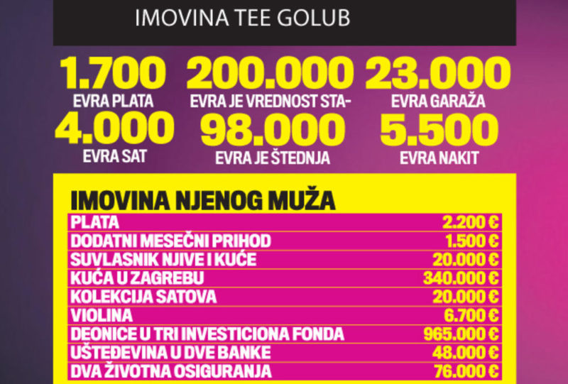 Во имотниот лист на Теа Голуб стои дека поседува стан од 103 квадратни метри во Загреб, вреден 200.000 евра, и гаража од 19 квадратни метри, вредна речиси 23.000. За двете недвижности таа изјавила дека ги добила подарок. Подарок добила и часовник од 4.000 евра и друг накит од 5.500 евра. Во две банки, напишала таа, има вкупна заштеда од 98.000 евра. И тоа го навела дека е подарок.