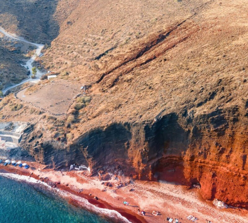 Црвената плажа се наоѓа во близина на античкиот локалитет Акротири.