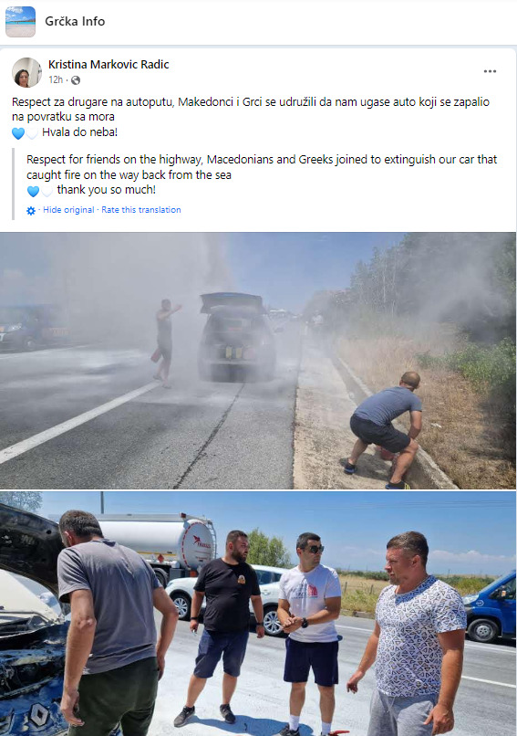 „Почит за нашите пријатели на автопатот, Македонци и Грци се здружија да ни го изгаснат автомобилот што се запали на враќање од море“, пишува семејството.