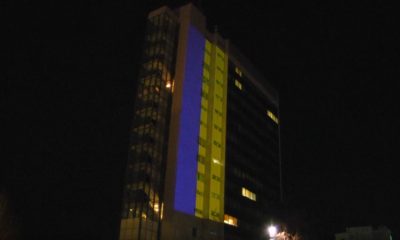 Зградата на Владата на Косово синоќа беше осветлена со знамето на Украина во знак на солидарност со таа земја откако Русија ги призна украинските сепаратистички региони...