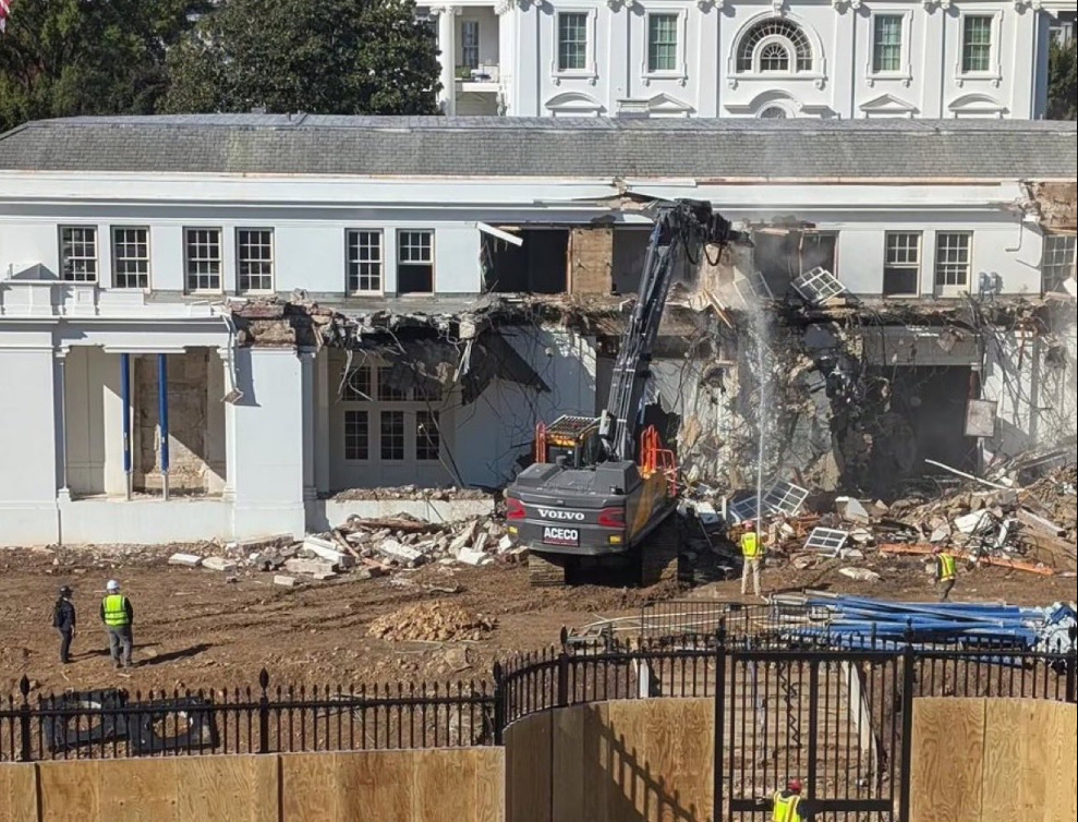 Багерите почнаа со уривање на фасадата на зградата, дел од комплексот на Белата куќа во кој се наоѓаа канцелариите на првата дама, театарот и влезот за посетители каде што беа пречекувани странски достоинственици.