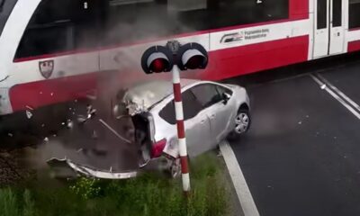 Полските државни железници (PKP) објавија драматично видео од несреќата во која воз удри автомобил на шините. Опасниот инцидент се случил откако возачот поминал низ спуштени рампи...