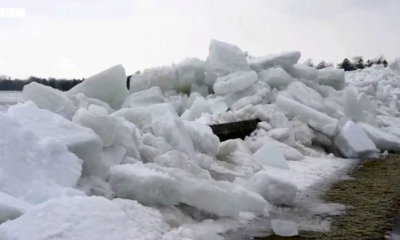 Полицијата презентира видеоснимки од огромни парчиња лед што се прелеваат преку насипот на реката Нијагара во близина на езерото Ери. Познат и со називот ледено туркање,...