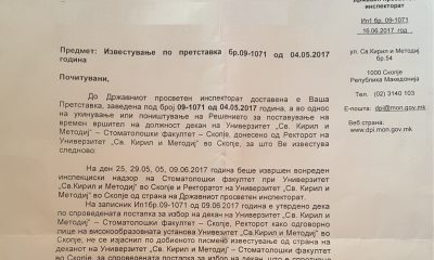 Државниот просветен инспекторат утврдил низа незаконитости и неправилности во работата на ректорот на Универзитетот ,,Св. Кирил и Методиј”, проф. д-р Никола Јанкуловски, за неизборот на проф....
